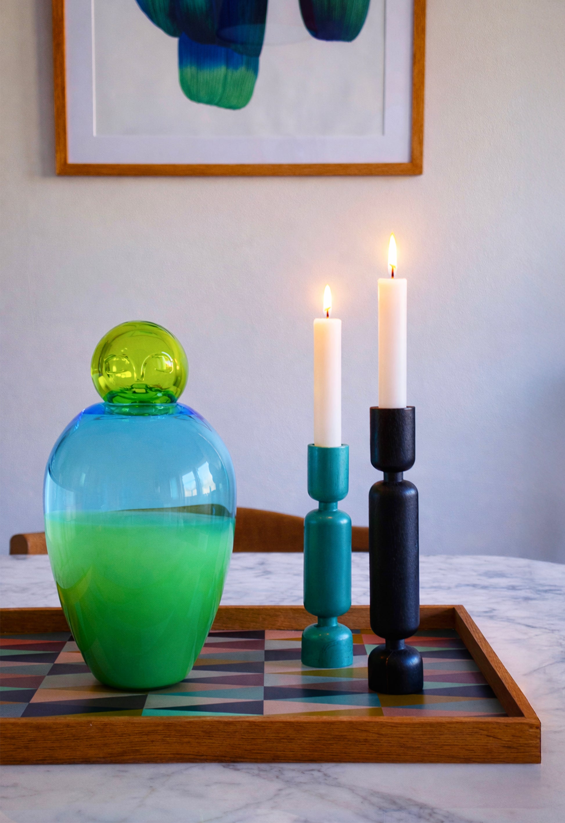 Our two-piece product is expertly mouth-blown and features carefully hand-placed organic shapes, designed to bring playfulness and unique character to your space.